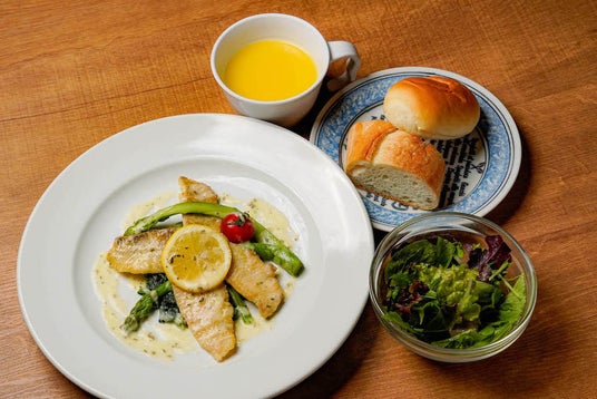 香ばしく焼き上げたカレイはバターの豊かな香りとレモンの爽やかな酸味が絶妙にマッチし、白身魚の繊細な味わいを引き立てます。パン、またはライスお選びいただけます。