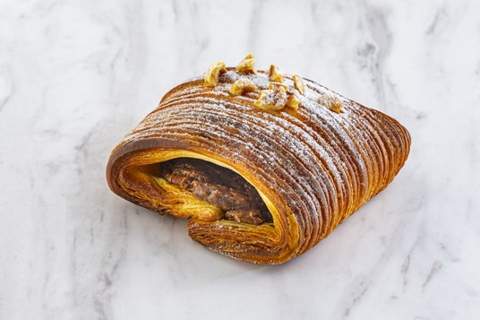 パリッとした食感で縞模様が美しいクロワッサン生地に、ヘーゼルナッツ風味の濃厚なカスタードクリームとまろやかなミルクチョコレートを合わせました。甘さの中にほんのり香るナッツの風味がアクセントとなり、奥深いリッチな味わいが広がります。朝食やコーヒータイムにもぴったりの、満足感あふれる逸品です。