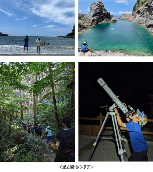 日中は登山に挑戦したり、海に飛び込んでみたり、崖を越えて絶景探検をしたりと心躍る冒険が盛りだくさん。夜は満天の星を見あげて宇宙体験。もちろん天体望遠鏡での天体観測も行います。食事はみんなでアウトドア料理、寝るのはテントに寝袋です。