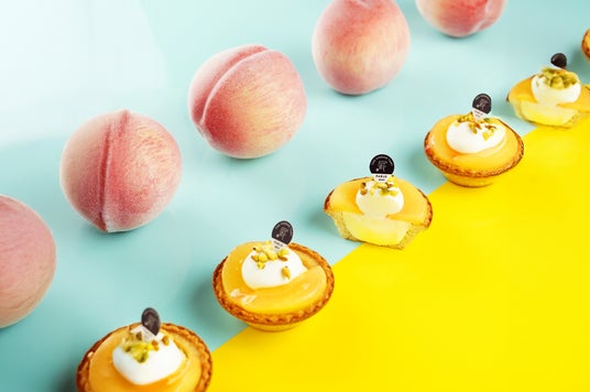こんがりと焼き上げたチーズタルトに桃のスライスを重ねて中心にヨーグルトホイップクリームを絞り、ローストピスタチオをあしらいました。桃の甘い香りと果肉の食感に、柔らかな甘さのヨーグルトホイップクリームで爽やかな味わいのチーズタルトに仕上げております。
