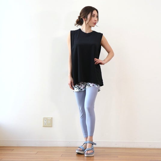 そこで普段使いにも最適な “くすみカラー”を採用し、ファッションとしても活躍する水陸両用レギンスを目指しました。肌馴染みが良く、着回しがしやすいカラーは普段使いのコーディネートにも自然と溶け込みます。水陸両用を実現するため、紫外線保護指数の高い生地で接触冷感、吸水速乾機能もプラス。海やプールなどのレジャーはもちろん、ウォーキングなどの軽い運動時や普段の外出着にも活躍する一枚にこだわりました。