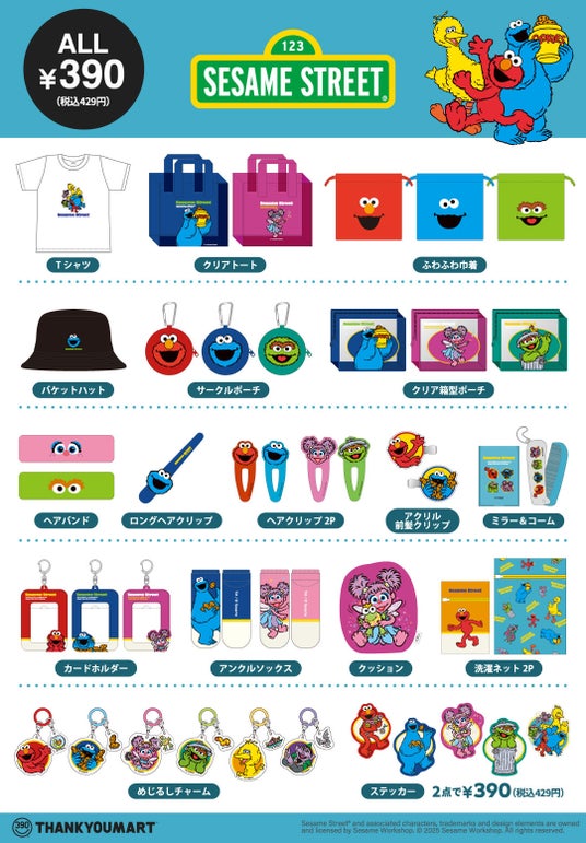 「Be Smile, Be Kawaii」をテーマに、キャラクターの限定アイテムを中心としたカワイイ推しグッズがいつ来てもALL390円で手に入るショップ「サンキューマート」は、子ども向けテレビ番組『セサミストリート』のオリジナルデザイン雑貨を、全国のサンキューマート店舗で5月下旬より入荷次第販売開始いたします。