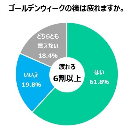 ファミリーマートが実施した調査で、「GWの後は疲れるか」と尋ねたところ、61.8%が「疲れる」(※図1)と回答し、「GWが終わった時の気持ち」で当てはまるものとして、「仕事モードへの切り替えが大変」が1位(50.4%)(※図2)となりました。GW後は「英気を養えた」と感じる人よりも、長期間の休みによる「GW疲れ」を感じている人が多いことが分かります。