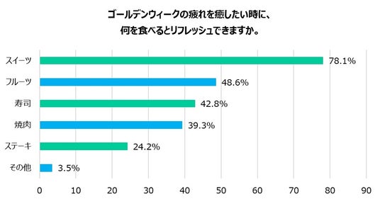 さらに、「GWの疲れを癒したい時に、何を食べるとリフレッシュできるか」尋ねたところ、78.1%が「スイーツ」と回答し(※図3)、「ご自身がご自宅で食べるご褒美スイーツの予算」は「500円以内」が1位(45%)となりました。(※図4)