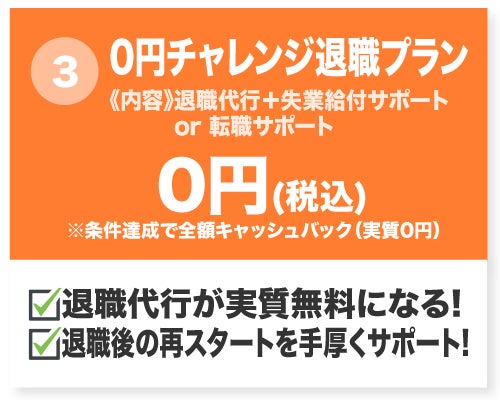 - 0円チャレンジ退職プラン:条件達成で全額キャッシュバック(実質0円)