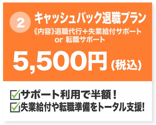 - キャッシュバック退職プラン:5,500円(税込)※退職代行+失業給付/転職サポート