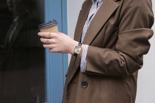 深みのあるダークブラウンとピンクゴールドケースに黒の文字盤を合わせたシックなモデル。大人っぽいコーディネートには、甘くなりすぎず引き締めてくれるこのアイテムが必須。