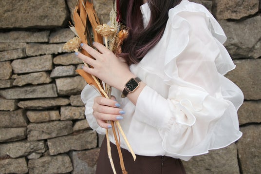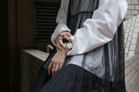 ニュアンスカラーの代表ともいえるグレージュレザーに、ピンクゴールドケースと落ち着いたホワイトの文字盤を合わせたモデル。キレイ目のトップスにチュールスリーブを合わせた上品なスタイリングはまさにピッタリで、気になっていたオシャレなパン屋さんに行きたくなるコーディネートの完成です◎