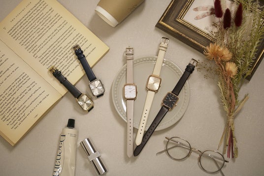 角を落としたクラシカルなレクタンギュラケースと絶妙なニュアンスカラーのレザーベルトが、かわいい系からカッコいいスタイルまで、さまざまなファッションに合わせやすい万能な1本。