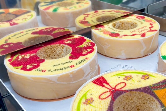 お菓子の表面に、まるで一枚の絵画のように施されたデザインは、特殊な印刷技術によって実現されています。職人がひとつひとつ丁寧に調整し、色鮮やかな「ありがとう」の文字や、母の日にふさわしい華やかな花柄を美しく表現。まるで本物の花束のような繊細さと美味しさを、そのままスイーツに閉じ込めました。