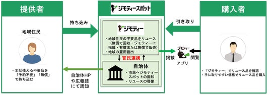 ジモティースポットは、「不要になったけれどもまだ使えるモノ」を地域のコミュニティ内で有償または無償で譲り合うことが出来るサービスです。持ち込み希望の方は、ジモティースポットに持ち込むだけで、手軽に必要とする人に譲渡することができます。そして、譲り受け希望の方は、持ち込まれたモノの情報をジモティーで検索し、ジモティースポットで引き取ることでマッチングが成立する仕組みとなっています。