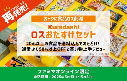 ソーシャルグッドマーケット「Kuradashi」を運営する株式会社クラダシ(本社:東京都品川区、代表取締役社長CEO:河村晃平、以下「クラダシ」)は、株式会社ファミリーマートが運営するEC「ファミマオンライン」にて4月に販売した「ロスおたすけセット」の好評を受け、5月13日から数量を増やして販売することが決定しましたので、お知らせいたします。