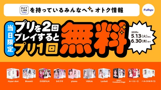 フリュー株式会社(本社:東京都渋谷区、代表取締役社長:三嶋隆、以下 フリュー)は、全国のアミューズメント施設に設置する対象のプリントシール(以下 プリ)機にて『当日3回目お得サービス』を5月13日(火)から6月30日(月)の期間限定で実施いたします。