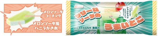 メロンソーダ風バニラかき氷をメロンソーダコーチングで包んだアイスバーです。メロンソーダ風バニラかき氷は、メロンソーダ風味のバニラアイスに細かな氷を少量混ぜ込み、「クリームソーダのうまいとこ」のシャリシャリ食感を表現しています。アイスミルク規格であるバニラアイスのしっかりとしたミルク感と爽やかな風味のメロンソーダコーチングをバランス良く仕上げました。