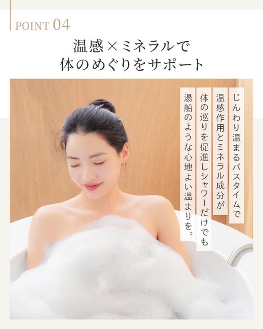 硫酸マグネシウムと塩化マグネシウムがじんわりと温め、シャワーでも湯船のような心地よい温まりを感じる