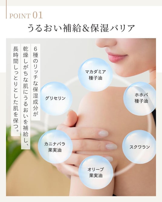 一度のケアで、乾燥しがちな肌にうるおいを補給。6種のリッチな保湿成分がしっとりなめらかな肌をキープ。