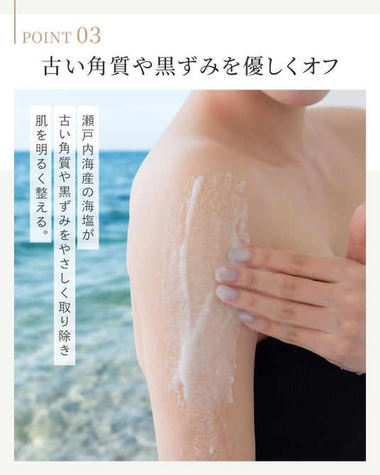 瀬戸内海産の海塩が、古い角質や黒ずみをやさしく取り除き、肌を明るく整える。