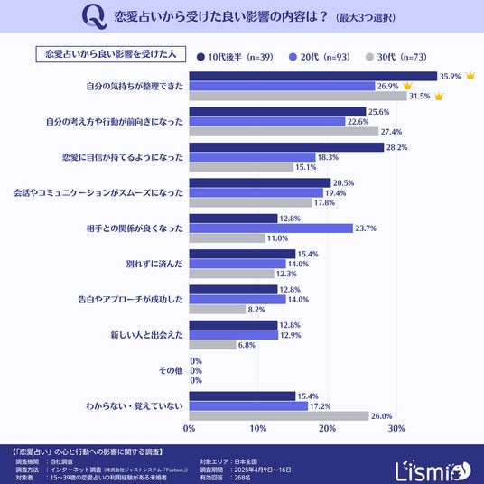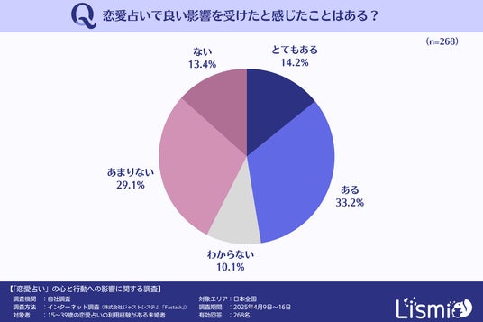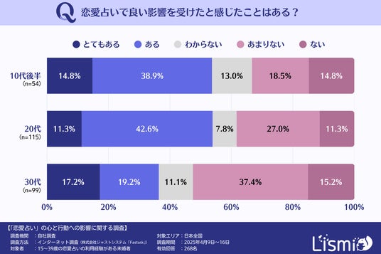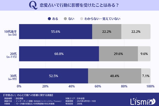 チャット占いアプリを提供する株式会社リスミィ( https://lismi.jp/ )(本社:大阪府大阪市、代表:池内康浩)は、恋愛占いが未婚男女の心理や行動に与える影響について調査するため、15~39歳の未婚男女268名を対象にアンケートを行いました。本調査では、恋愛占いが若い世代を中心に心理的な支えや行動のきっかけとなっており、結果に対して主体的に向き合う利用者が多いことが明らかになりました。