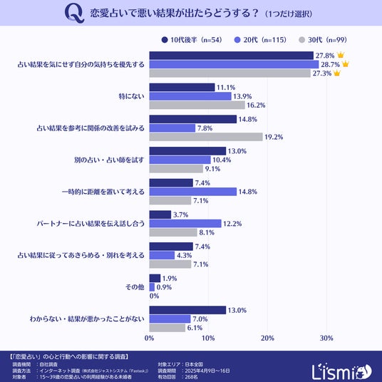 年代別に見ると、どの年代でも「占い結果を気にせず自分の気持ちを優先する」が最も多い回答となりました。割合は、10代後半で27.8%、20代で28.7%、30代で27.3%となっています。
