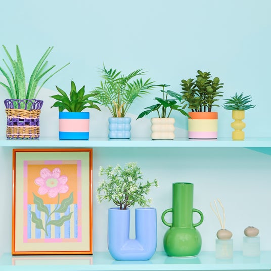 ポット付きのアートグリーンです。もこもことした形状や、カラフルなペイントを施したポップなデザインのポットは、置くだけでインテリアのアクセントに。デスクやサイドテーブルに飾りやすい小さめサイズです。