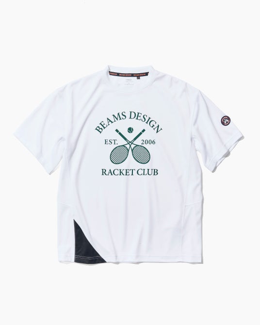 ●グラフィックTシャツ 3,999円(税込)クラシックな「BEAMS DESIGN RACKETCLUB」グラフィックが特徴のテニスコレクション。吸水速乾のドライスムースメッシュ生地を使用したテニスグラフィックTシャツ。手を上げやすいよう脇にカッティングを入れています。フロントの右下裾は、サングラスを拭くように生地を切り替えにしており、デザインだけでなく実用性にもこだわった仕様になっています。