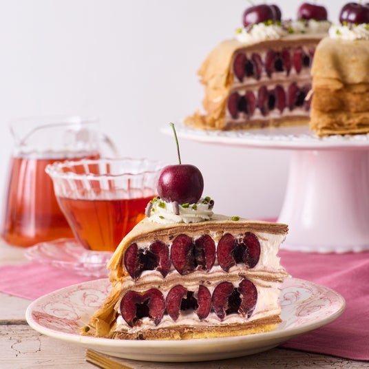 アメリカンチェリーをたっぷり使用し、キルシュホイップとチョコレートホイップ、クレープ生地を丁寧に重ね、食感の良いチョコフレークとヘーゼルナッツを合わせました。