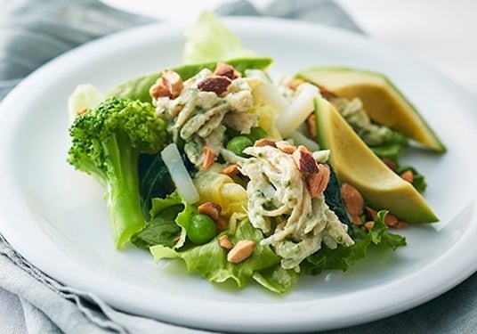 ●<RF1>アボカドとハーブチキンのグリーンサラダ 100g 税込540円/ローストして旨みを引き出したみつせ鶏に、フレッシュバジルを使用した香りの強いハーブソースを絡めました。
