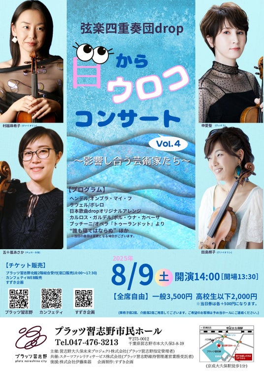 習志野大久保未来プロジェクト株式会社主催、『弦楽四重奏団drop 目からウロココンサートVol.4』が2025年8月9日(土)に習志野市民ホール(プラッツ習志野)(千葉県習志野市本大久保3丁目8-19)にて開催されます。