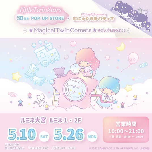 さまざまなキャラクターグッズを企画・販売している株式会社KThingS(東京都中央区)はルミネ大宮 ルミネ1 2Fにて『LITTLE TWIN STARS 50周年 POP UP STORE ×むにゅぐるみパティオ』を2025年5月10日(土)~2025年5月26日(月)の期間で開催いたします。