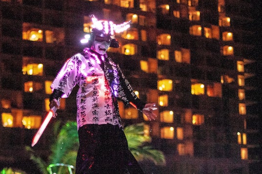 人に悪さを働く妖怪“マジムン”に取り憑かれた光武士。その身を光らせて迫ってくる武士を水鉄砲で対抗し、みんなで光が消えるまで撃ち続けるゲームです。