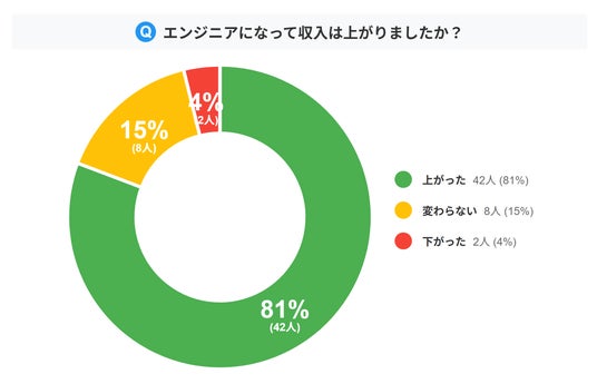 調査の結果、エンジニアに転職した女性の81%(42人)が「収入が上がった」と回答しており、 大多数が転職によって収入面でもポジティブな変化を経験していることが分かります。 15%(8人)が「変わらない」、 4%(2人)が「下がった」と回答しています。 全体として、エンジニア転職は収入アップにつながる選択肢であることが示唆されています。