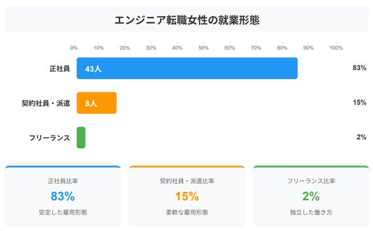 棒グラフからも明らかなように、正社員の割合が非常に高く、多くの女性がエンジニアとして安定した雇用形態で働いていることがわかります。 これは、エンジニアスキルを身につけることで、安定した雇用と柔軟な働き方を両立できる可能性を示唆しています。