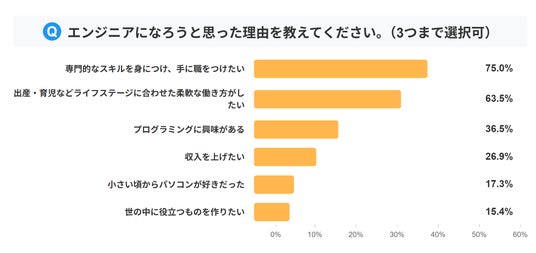 エンジニアになろうと思った理由の上位3つは、 専門的なスキルを身につけ、手に職をつけたい(75.0%)、 出産・育児などライフステージに合わせた柔軟な働き方がしたい(63.5%)、 プログラミングに興味がある(36.5%) となっています。