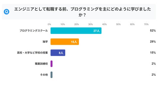 調査結果から、エンジニアに転職した女性の学習方法としては プログラミングスクール(52%)が最も多く、 次いで独学(29%)、 高校・大学など学校の授業(15%)という順になっています。 職業訓練校(2%)の利用者は少数派でした。