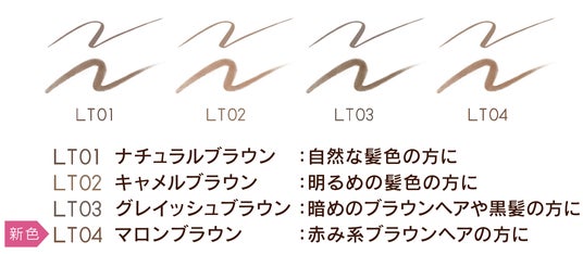 好評の「LT01(ナチュラルブラウン)」、「LT02(キャメルブラウン)」、「LT03(グレイッシュブラウン)」の色味はそのままに、看板商品「パウダー&ペンシル アイブロウEX」の人気色を踏襲したトレンドの赤みのあるブラウンカラー「LT04(マロンブラウン)」を追加。より髪色にあわせた色選びができるようになりました。
