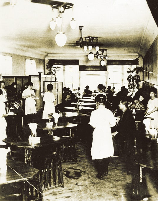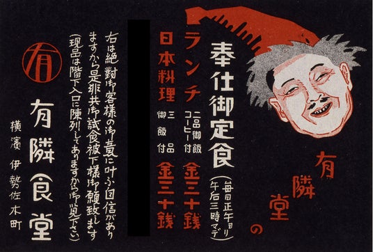 1909年伊勢佐木町で創業した有隣堂は、1921年には店舗の2階に「有隣食堂」という形で今日でいうレストランを営業していました。メニュー表には、西洋文化が入り始めた当時に考案されたといわれるカレーライスやハヤシライスといった日本版西洋料理、マカロニグラタン、スパゲッティなどのイタリア料理があり、伊勢佐木町のなかで先端をゆくレストランだった様子が伺えます。