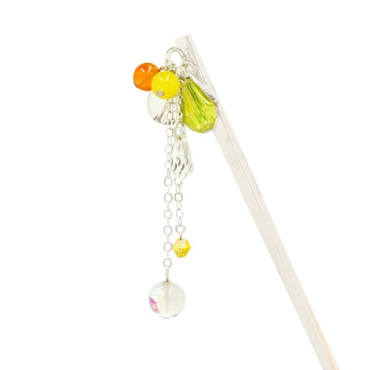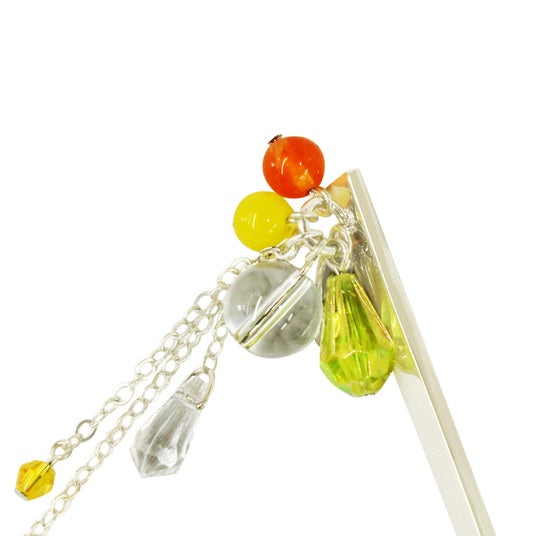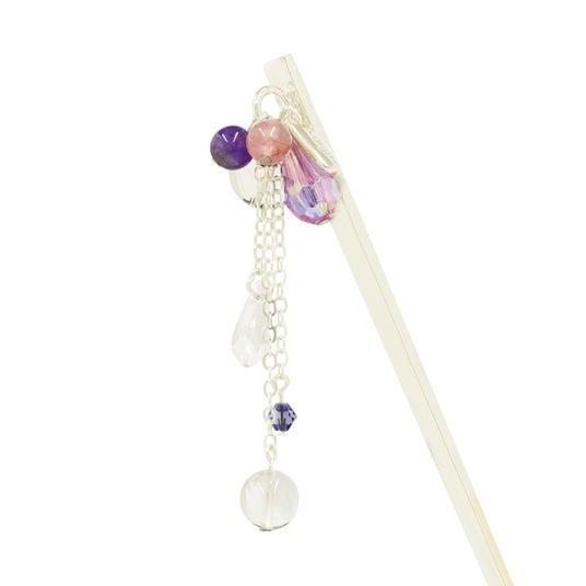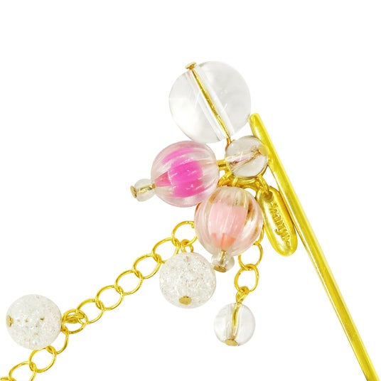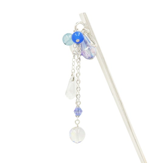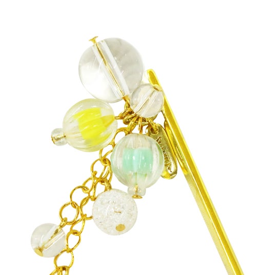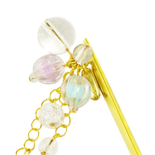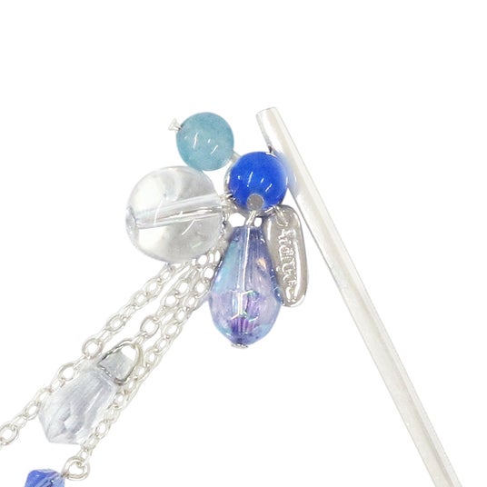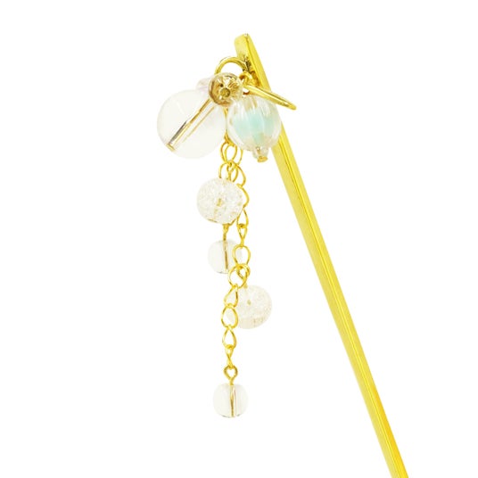 シンプルな色使いで、しなやかに下がるビーズが清涼感を演出。ゴールドやシルバーを基調とした軸との組み合わせで上品さを添えながらも、重ね付けにも馴染む洗練された簪です。季節や装いを問わず普段使いしやすいデザインに仕上げました。