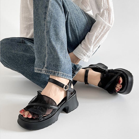 商品名:軽量厚底 チュール フリル ヒールソール サンダル 5985