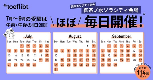 夏の会場受験は満席になるケースが多いため、関東エリアで人気の高い御茶ノ水ソラシティ(所在地:東京都千代田区)において、7月から9月の期間中ほぼ毎日、午前・午後の1日2回TOEFL iBT(R)を実施します。これにより、テスト実施回数が新たに114回追加となり、より柔軟なスケジュールで受験することが可能になります。さらに、神奈川県横浜市および千葉県柏市に新たな会場を2か所増設しました。この機会をぜひご活用いただき、早めの受験計画にお役立てください。