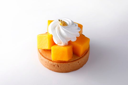 サクサクのタルト生地にカラメルソース、カラメルカスタードクリーム、ココナッツジュレを生クリームの下に忍ばせました。アクセントにライチを入れ、濃厚なマンゴーを乗せたマンゴーの甘さが引き立つタルト。