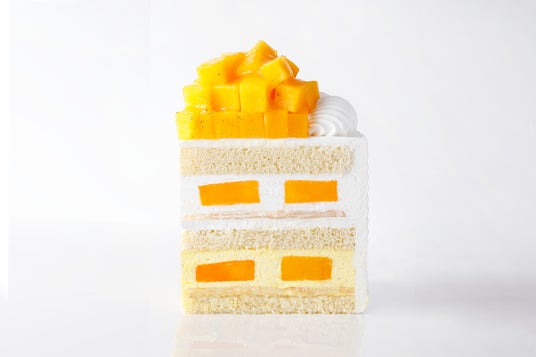 “太陽の果実”とも称される国産アップルマンゴーを約1個丸ごと使用。パッションフルーツ入りの葛を絡めたツヤのあるマンゴーをトッピング。またマンゴーの濃厚な甘みを引き立たせるため、口当たり軽やかな九州大牟田産の生クリーム、マンゴーとパッションフルーツ風味のクリームを採用し、スポンジ生地には、無農薬の玄米を食べて育てた鶏から生まれた「玄米卵」を使用。各層に忍ばせた滑らかでみずみずしいライチの層が爽やかな後味に仕上げました。