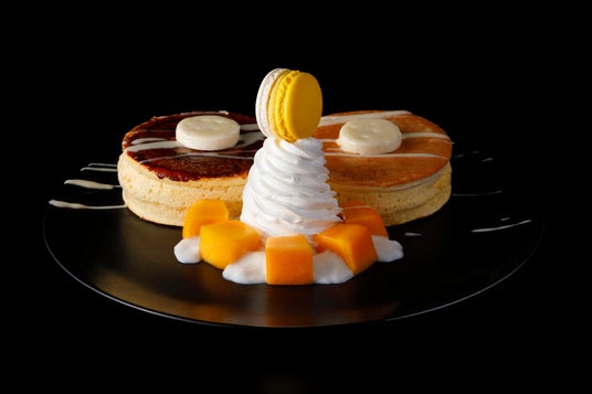 リコッタ・クリームチーズ・マスカルポーネの3種類のチーズをブレンドした“ふわっふわ食感”のパンケーキ。1枚はキャラメリゼし、香ばしく仕上げました。トッピングには、ココナッツジュレをあわせた濃厚なマンゴー、生クリームの下にはカラメルソース、カラメルカスタードクリーム、ライチを忍ばせ、味わいの変化をお愉しみいただけるアクセントに。仕上げに豆乳ホワイトガナッシュを乗せた期間限定のパンケーキを3種類のメープルシロップをお好みであわせてお召し上がりください。