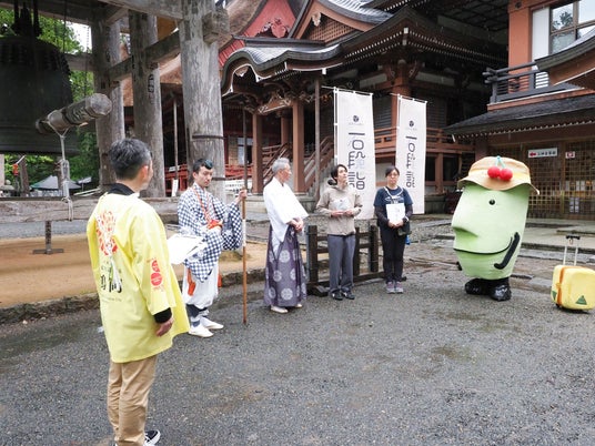 1万人突破の記念発表では、大阪府から訪れた岡本さんと、静岡県から訪れた島嵜さんが、出羽三山神社の阿部宮司、羽黒山伏とともにきてけろくん(山形県おもてなし局長)から祝福され、石段詣1万人記念の特別御朱印が揮毫された出羽三山神社の御朱印帳と、普段は頒布されていない特別授与品が贈られました。(以下、コメント要旨)