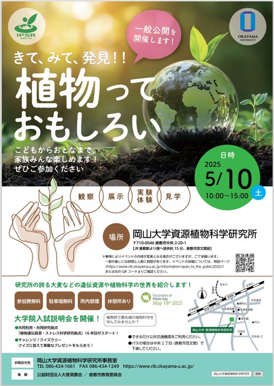 国立大学法人岡山大学(本部:岡山市北区、学長:那須保友)の高等先鋭研究院を構成する組織のひとつである資源植物科学研究所(倉敷市)は「岡山大学資源植物科学研究所2025年度一般公開『きて!みて!発見!植物っておもしろい』」を、2025年5月10日に開催しました。