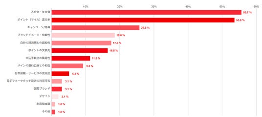 「ポイント(マイル)還元率」、および「入会金・年会費」を重視している人が圧倒的多数という結果になった。なお、その他には「キャンペーン・特典」や「ブランドイメージ・信頼性」を選ぶ人も多かった。