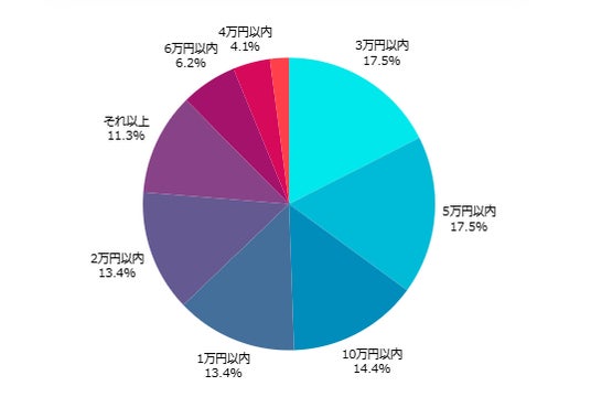学生のクレジットカードの毎月の利用額は、「3万円以内」と「5万円以内」が同率で17.5%と一番多かったが、他の選択肢にも同程度の票が集まっていた。