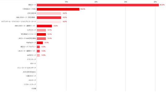 楽天カードが41.2%で最も多く、三井住友カード(NL)が14.4%でこれに続いた。また、ついでJCB CARD W、ANA JCBカード(学生専用)、セゾンパール・アメリカン・エキスプレス・カードが同率で8.2%となったが、楽天カードが圧倒的な割合を占めた。
