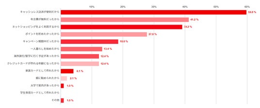 学生がクレジットカードを作るきっかけとしては、「キャッシュレス決済が便利だから」が59.8%で最も多く、「年会費が無料だったから」が41.2%でこれに続いた。また、「ネットショッピングをよく利用するから」も39.2%で3番目に多かった。