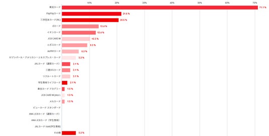 楽天カードが71.1%で圧倒的に多かった。また、PayPayカードが21.6%でこれに続いたほか、三井住友カード(NL)も20.6%の票を集めた。