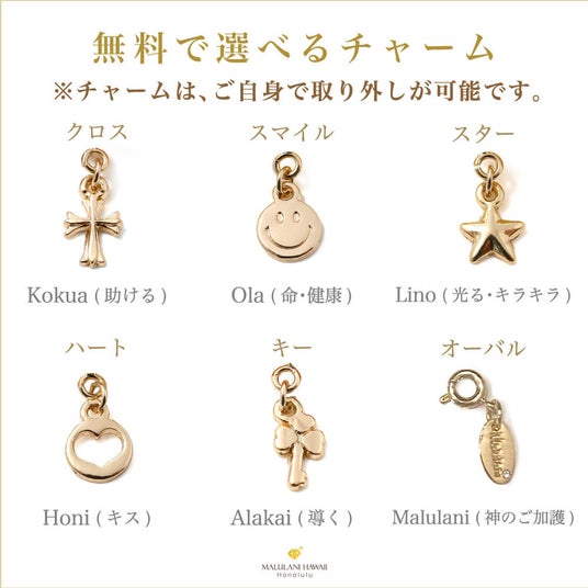数珠ブレスレットにお付けするチャームは、ハワイの言葉を刻んだ5種類のチャームと、Malulaniと刻印のオーバルチャームからお選びいただけます。